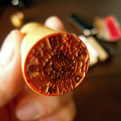 銀行印をご注文の際への一言で、友人のために、他にはない遊び心のある印鑑にしようと考えました。そしてお名前にまつわる5つのタイルを銀行印の中にちりばめることを思いつき、お彫りしました。この時に、文字以外のものを自分が彫れることに気付きました。